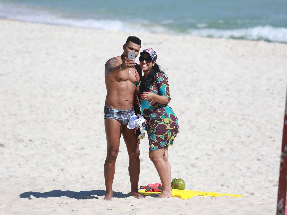 O casal 20 do funk carioca Naldo Benny e Ellen Cardoso, a Mulher Moranguinho, curtiram um dia de sol na Barra da Tijuca nesta terça-feira (18) e mostraram que adoram a atenção dos fãs. Enquanto Ellen tomava sol na areia, o cantor de Caipifruta e Me Pega de Jeito escutou algumas músicas no celular e decidiu dar um mergulho.