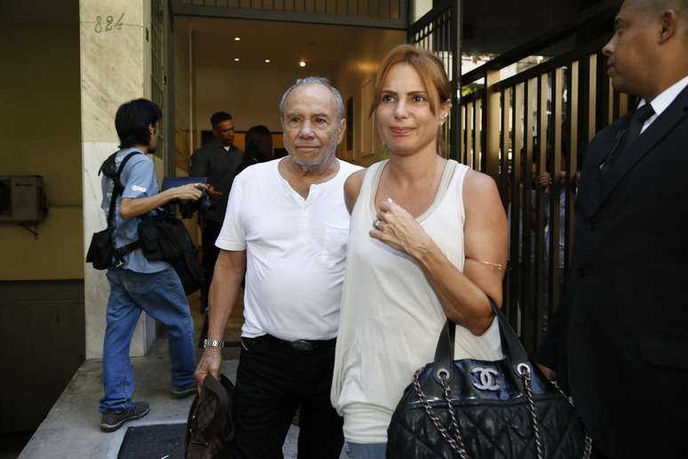 Mauro Mendonça e Rosamaria Murtinho deixa o velório de José Wilker no teatro Ipanema, no Rio de Janeiro