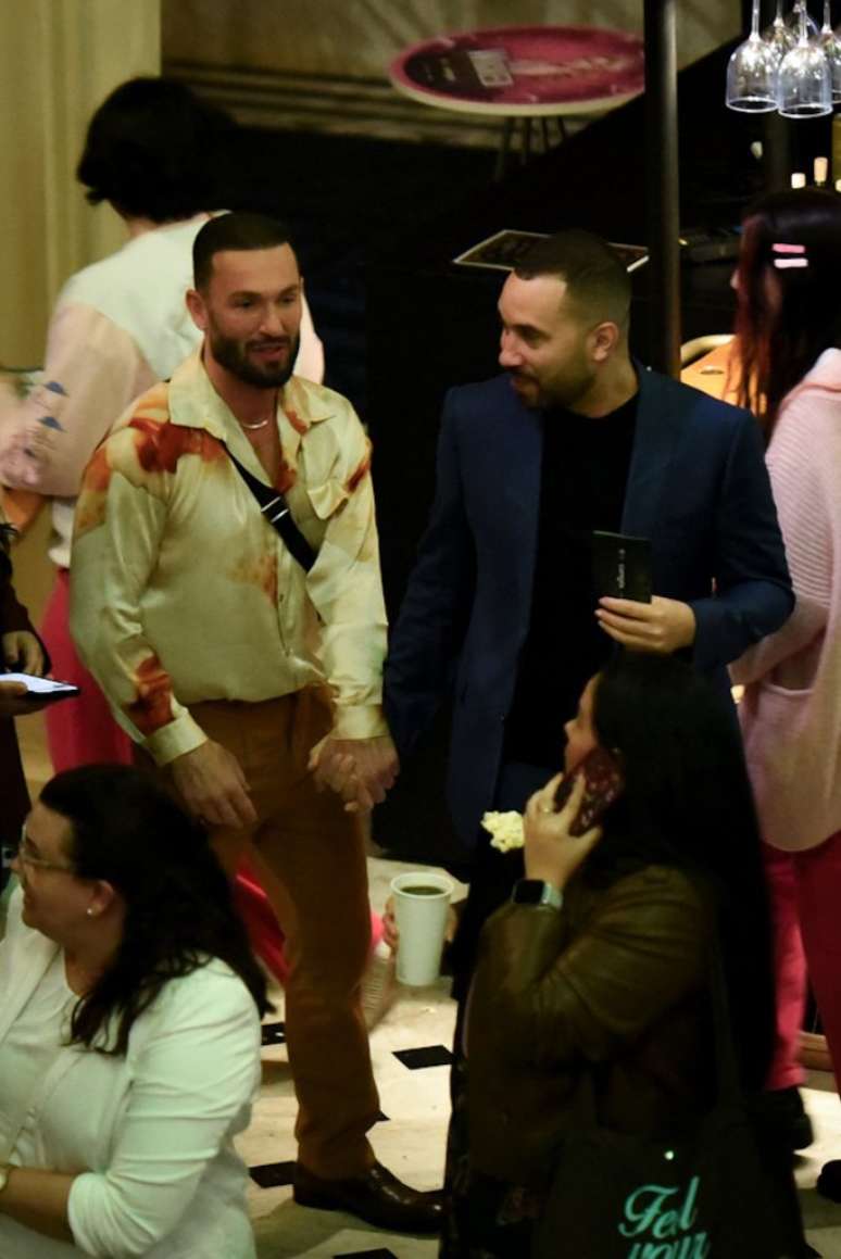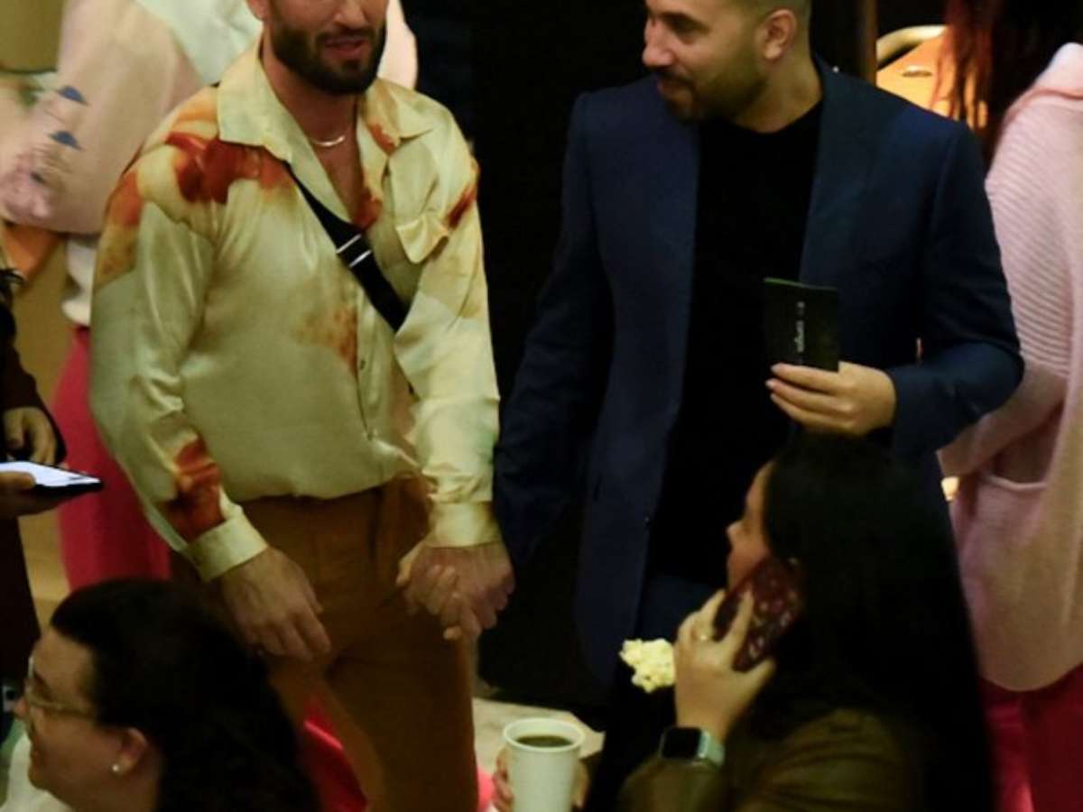 Ex-BBBs Diego Hypolito e Gil do Vigor chegam de mãos dadas em evento; os dois prestigiaram Gloria Groove como Madame Morrible no musical 'Wicked'.