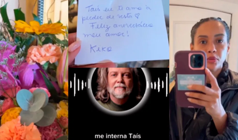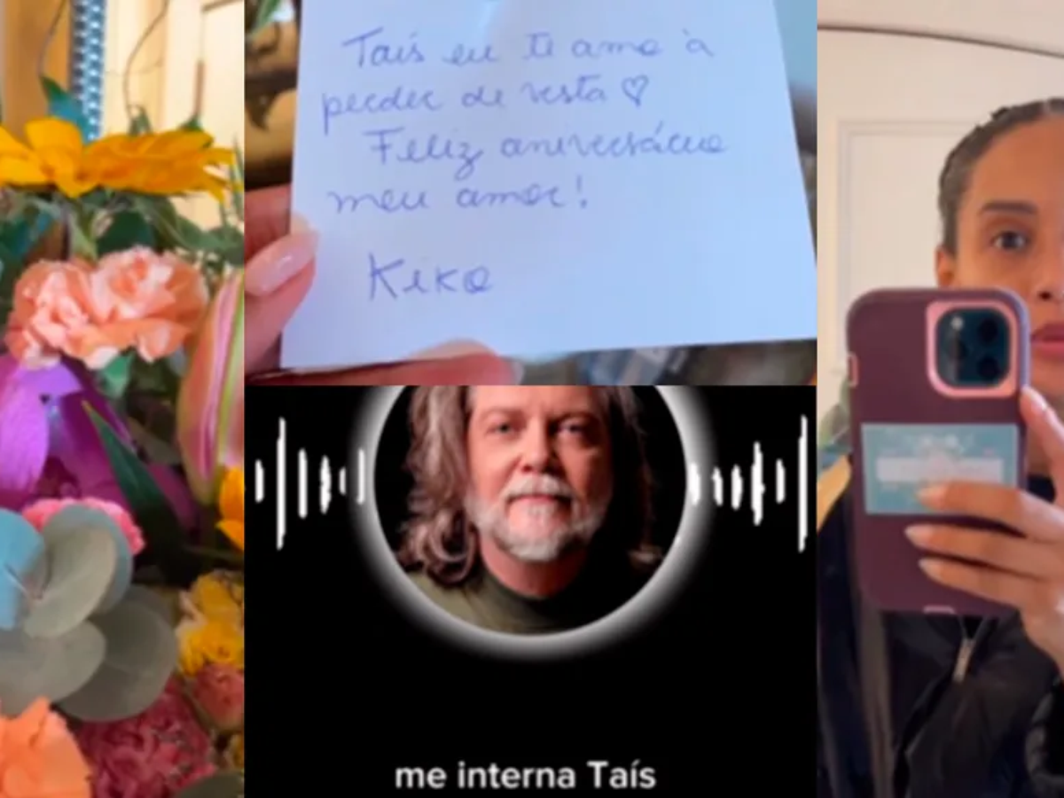 "Recebi esse lindo buquê de flores aí com o bilhete 'Taís eu te amo à perder de vista. Feliz aniversário, meu amor!' Kiko, meu aniversário é dia 25 de novembro, hoje é dia 11 de setembro, mas eu te amo a perder de vista," relata a atriz no vídeo.