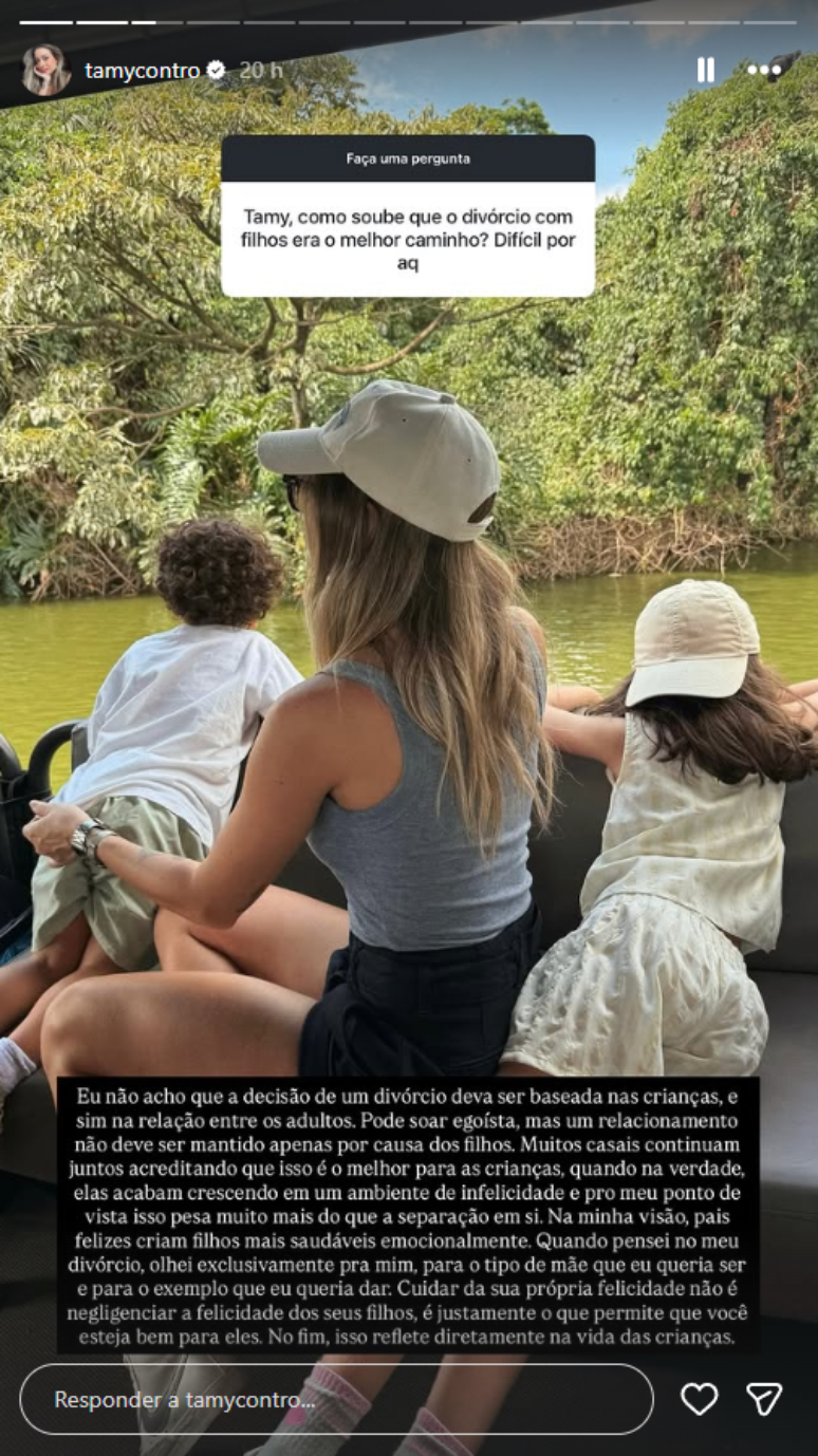 Mãe de Marieva, de 6 anos, e Otto, 3, Tamy rebateu a pressão social para que casais permaneçam juntos apenas "pelas crianças". Para ela, o bem-estar dos filhos é um reflexo direto da felicidade dos pais.