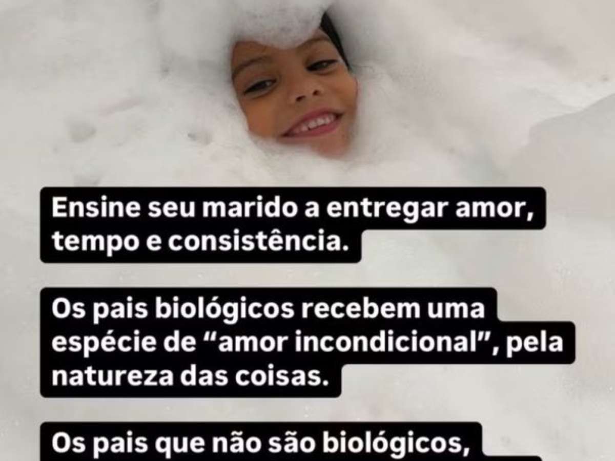 "Ensine seu marido a entregar amor, tempo e consistência. Os pais biológicos recebem uma espécie de amor incondicional pela natureza das coisas", escreveu ele. Na sequência, destacou os desafios de quem assume a paternidade por escolha: "Os pais que não são biológicos precisam conquistar o seu espaço, chegar no pianinho e a jornada te desafia e frustra por muitas vezes. Mas o maior aprendizado é: se entregar amor, receberá amor".