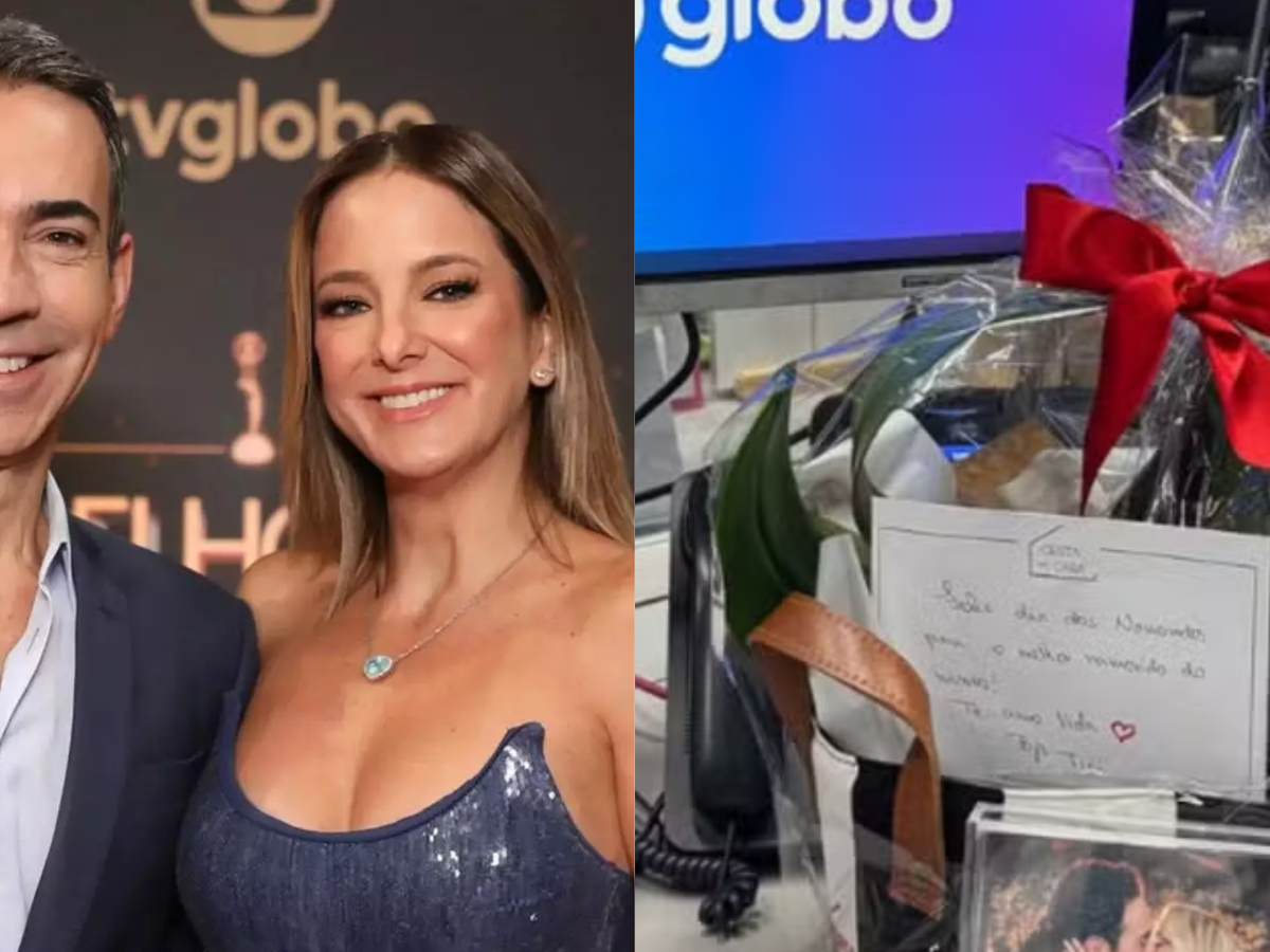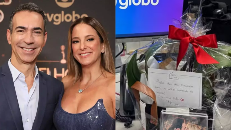 Ticiane Pinheiro emociona Cesar Tralli com flores e bilhete carinhoso para o marido nos bastidores da Globo; Tralli agradeceu gesto nas redes sociais