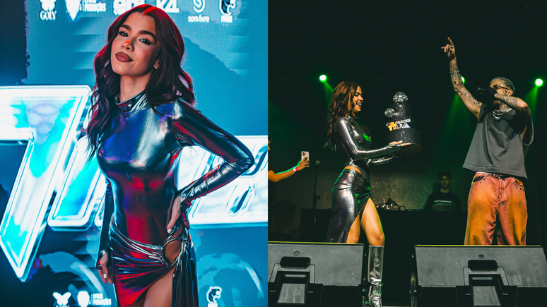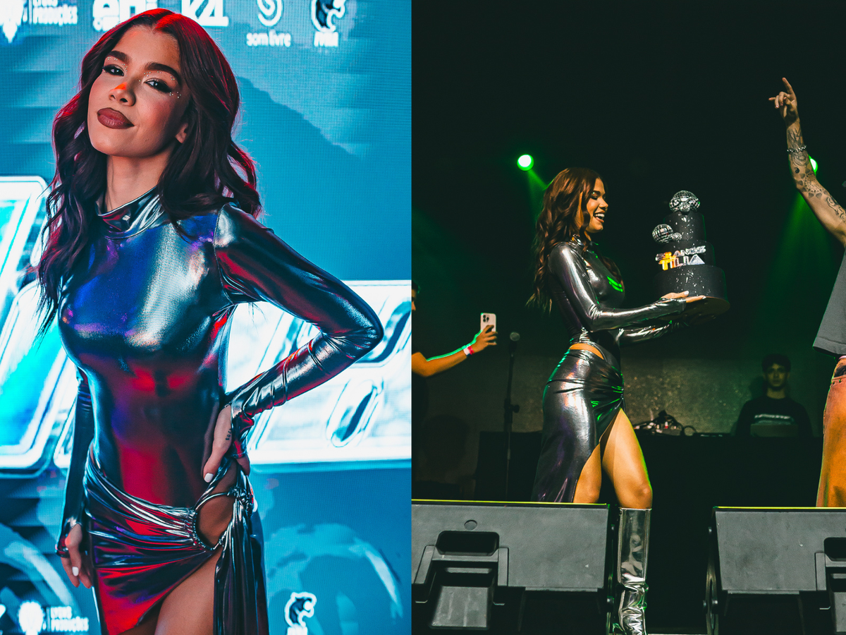 Tília impressionou ao exibir um dos looks que usou em sua grande festa, que aconteceu em São Paulo. Com dress code all black e tema Baile Funk, a artista optou por um vestido prateado colado ao corpo.
