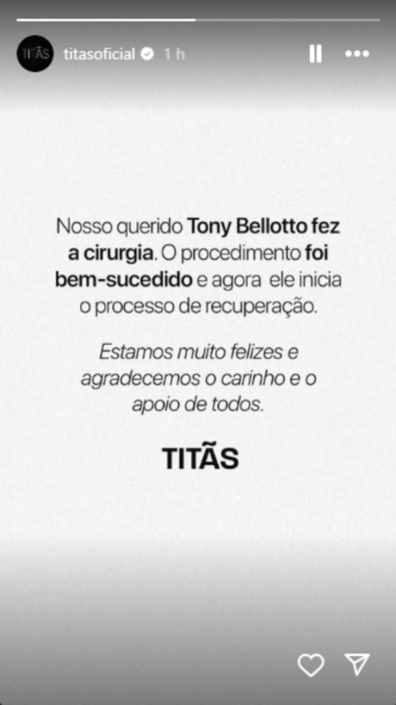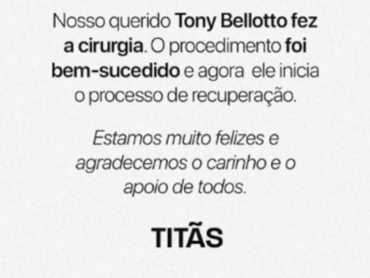 "Nosso querido Tony Bellotto fez a cirurgia. O procedimento foi bem-sucedido e agora ele inicia o processo de recuperação. Estamos muito felizes e agradecemos o carinho e o apoio de todos", lê a nota, compartilhada nos Stories.