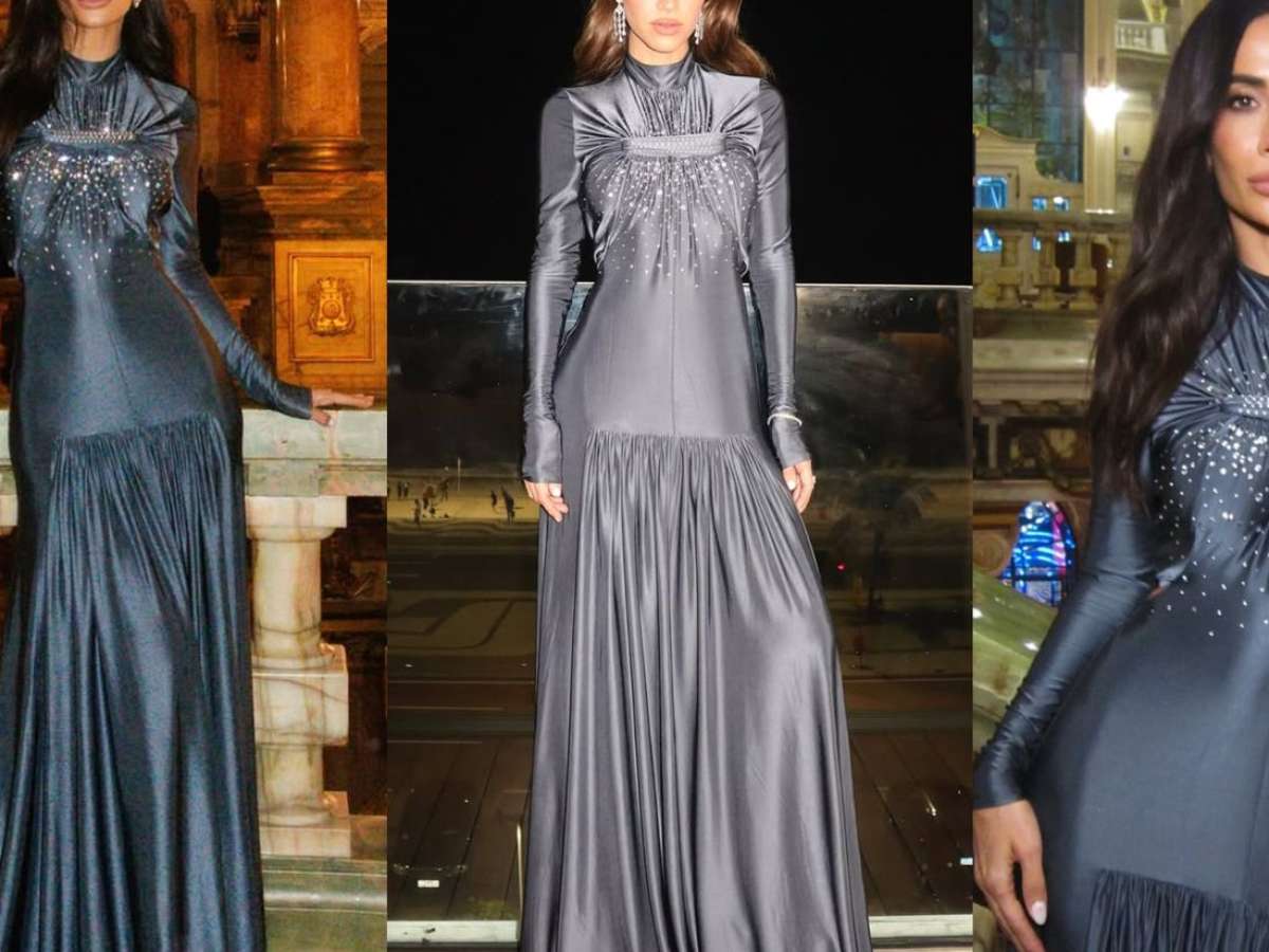 Silvia Braz e Alexandra Burnier protagonizaram uma coincidência de estilo digna dos melhores memes de moda: ambas surgiram com o mesmo vestido da grife francesa Rabanne — um modelo azul vibrante, de gola alta e mangas longas, adornado com hot fix prateado no busto. Avaliada em 1.790 euros (cerca de R$ 11,5 mil na cotação atual), a peça sofisticada foi um dos assuntos mais comentados da noite.