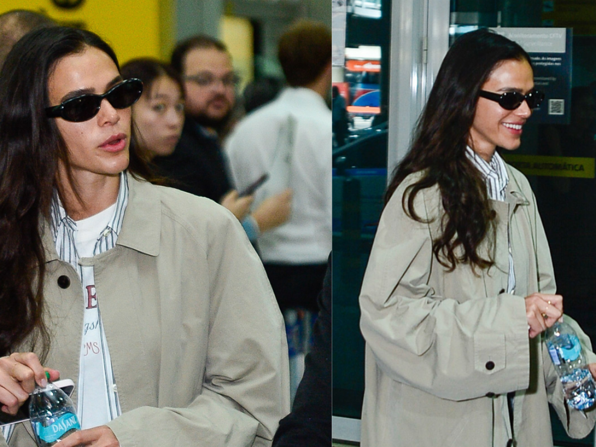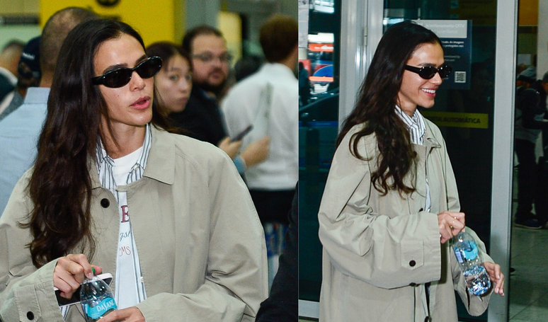 Trench coat cáqui, conjunto listrado e bolsa Gucci de R$ 12 mil: o aerolook comfy e elegante de Bruna Marquezine ao voltar dos EUA