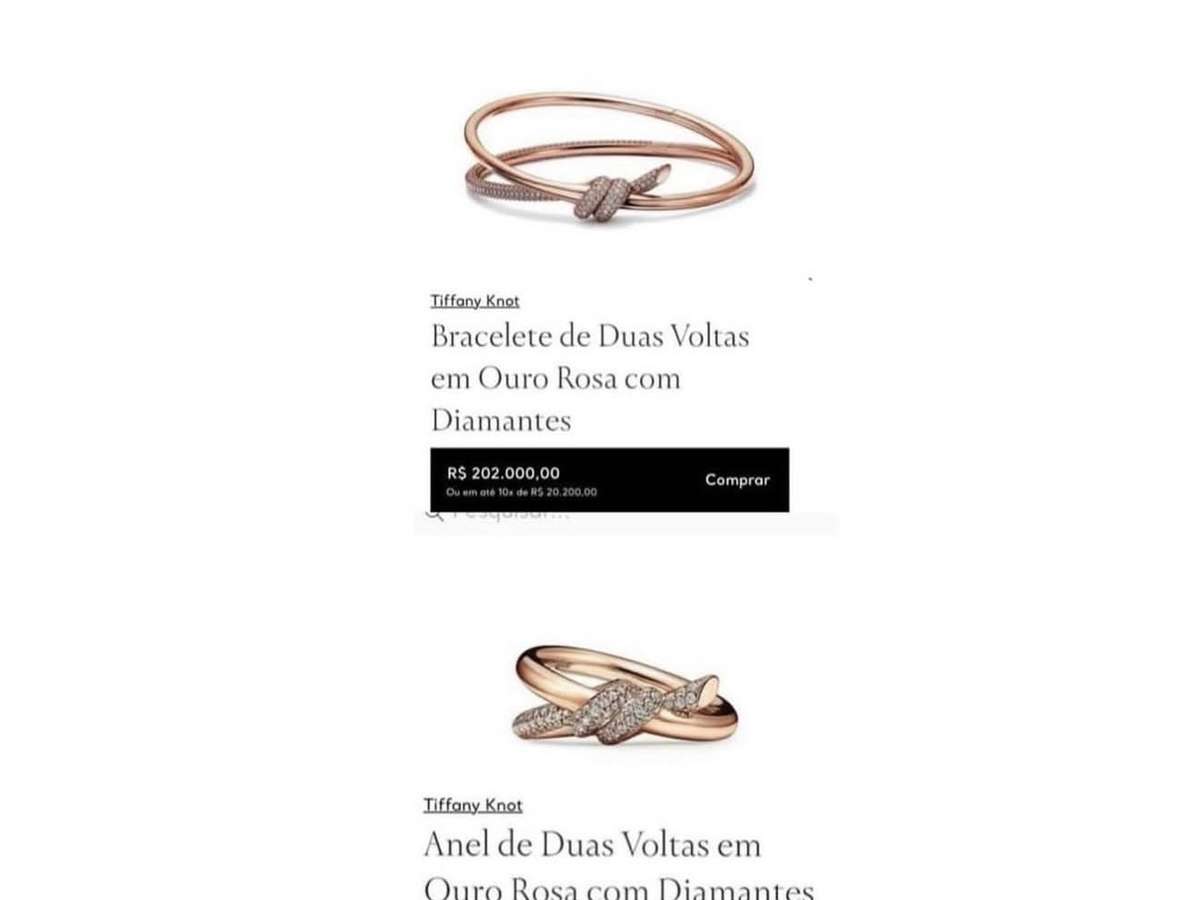 Pouco depois da surpresa, a influenciadora apareceu usando peças da Tiffany & Co., uma das marcas de joias mais prestigiadas do mundo. Os presentes escolhidos fazem parte da coleção Tiffany Knot, conhecida pela sofisticação do design e pelo acabamento em diamantes.