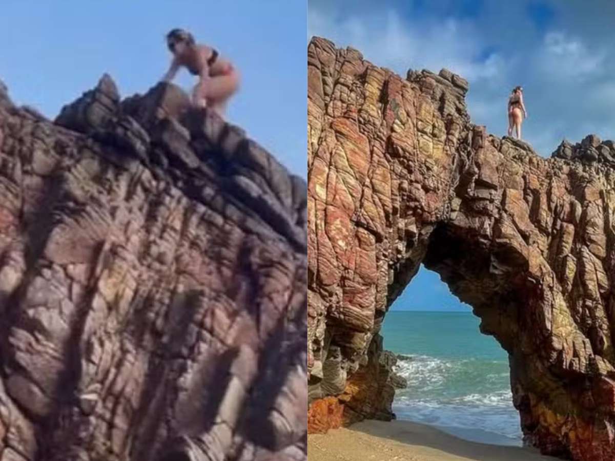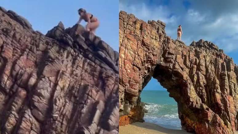 Influenciadora exibe foto na Pedra Furada, em Jericoacoara, e é confrontada por uma seguidora, que apontou a prática é irregular