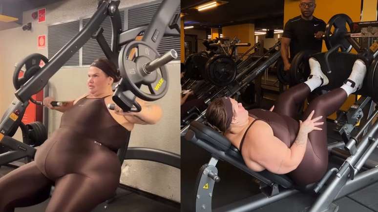 Nas redes sociais, Thais compartilhou a rotina de treino e disse: "Me carrega! Ser gostosa e saudável não é fácil", enquanto o personal trainner carregava os pesos dela para o próximo exercício.