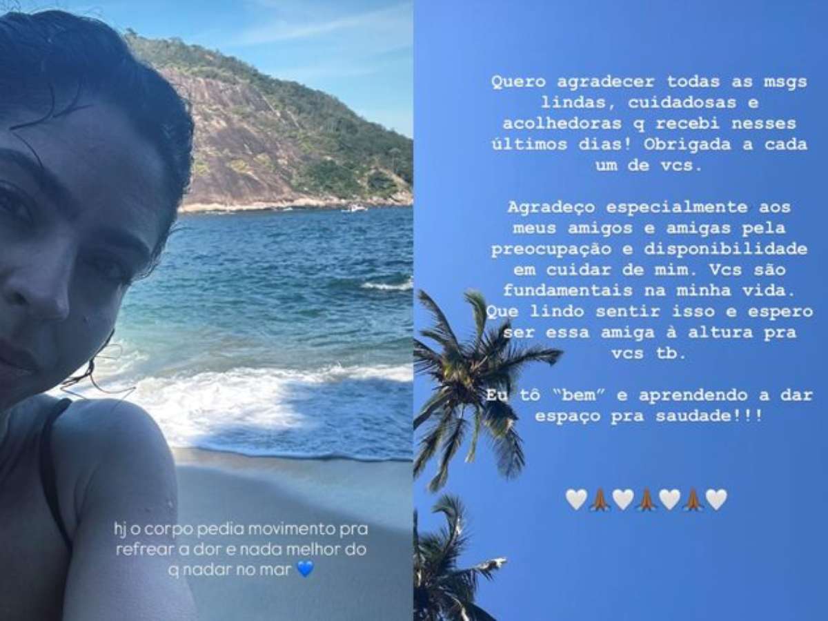 No sábado, 26, Bela já havia mostrado uma ida à praia para um mergulho na tentativa de se cuidar. "Hoje o corpo pedia movimento para refrear a dor e nada melhor do que nadar no mar", escreveu.