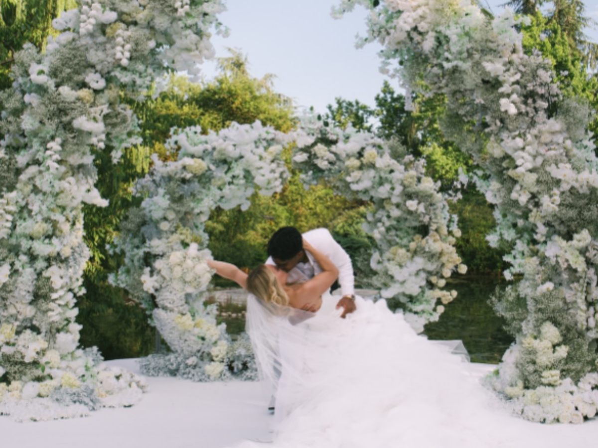 As imagens, todas em preto e branco, destacam a elegância do evento. A decoração foi composta por flores em tons suaves e um cenário natural com um lago ao fundo. A trilha sonora ficou por conta de músicos com violinos, reforçando o clima cerimonial. Os convidados seguiram um dress code formal, com trajes predominantemente pretos.