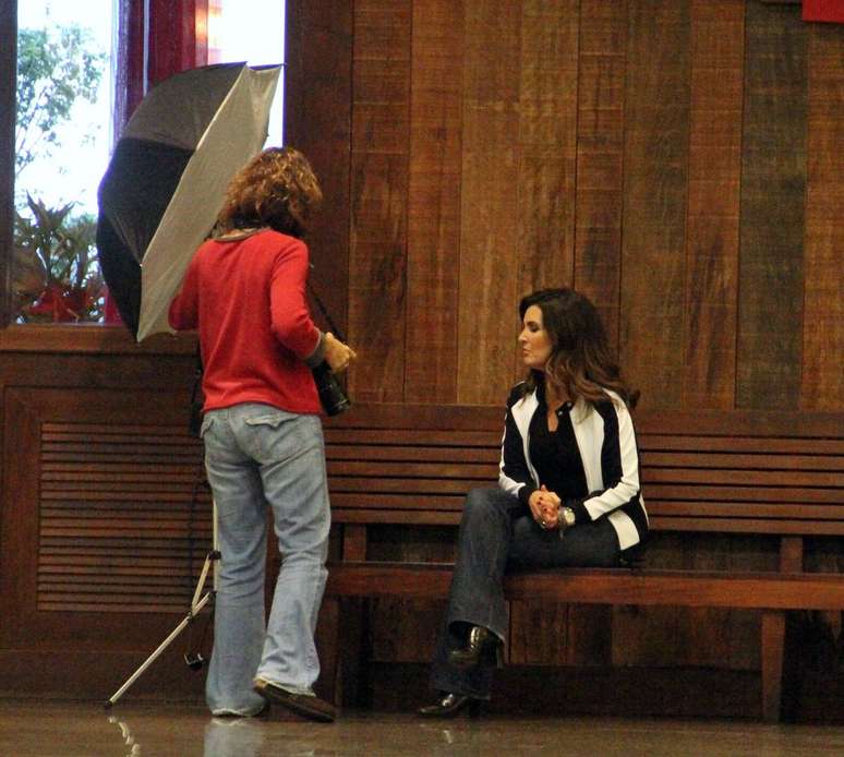 Fátima Bernardes realizou um ensaio fotográfico no shopping Rio Design Barra, no Rio de Janeiro, nesta quinta-feira (5). Com um visual discreto, a apresentadora posou em um banco de madeira no estabelecimento