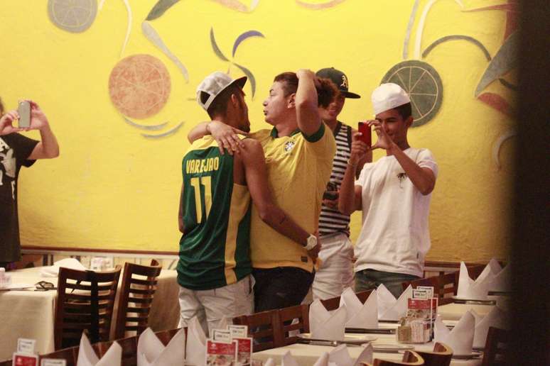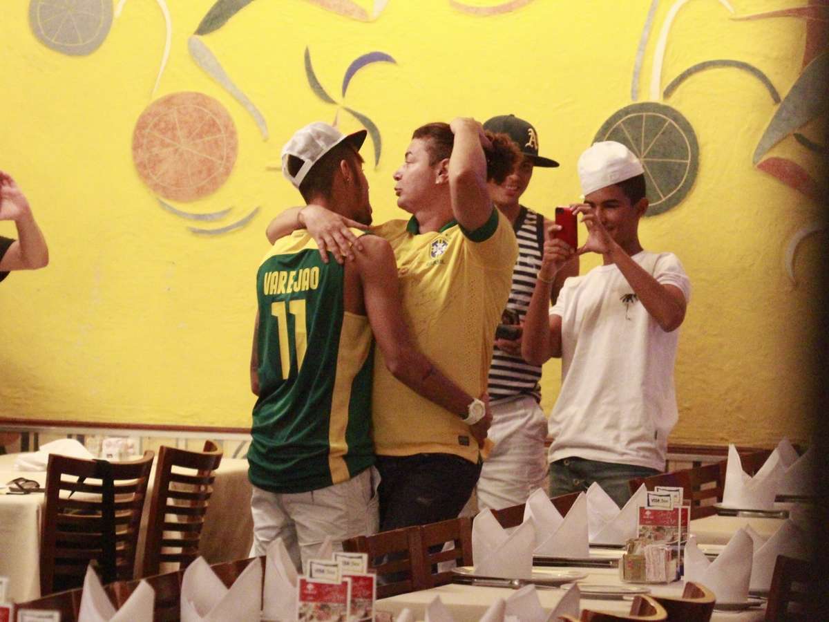 Neymar relaxou com amigos em um almoço nesta quinta-feira (18), em uma churrascaria na Barra da Tijuca, no Rio de Janeiro. Na ocasião, o jogador de futebol ainda deu uma camiseta da Seleção Brasileira ao promoter David Brazil, que retribuiu com um abraço