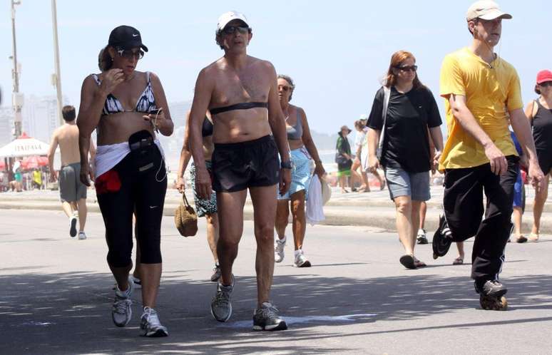 Acompanhada do marido Jaime, a atriz Totia Meireles se exercitou na orla do Leblon, no Rio de Janeiro, neste domingo (10). Por conta do calor, ela tirou a camiseta e a amarrou na cintura. Atualmente, Totia tem roubado a cena na novela 'Salve Jorge'. Na trama, ela interpreta a vilã Wanda, envolvida com tráfico de mulheres