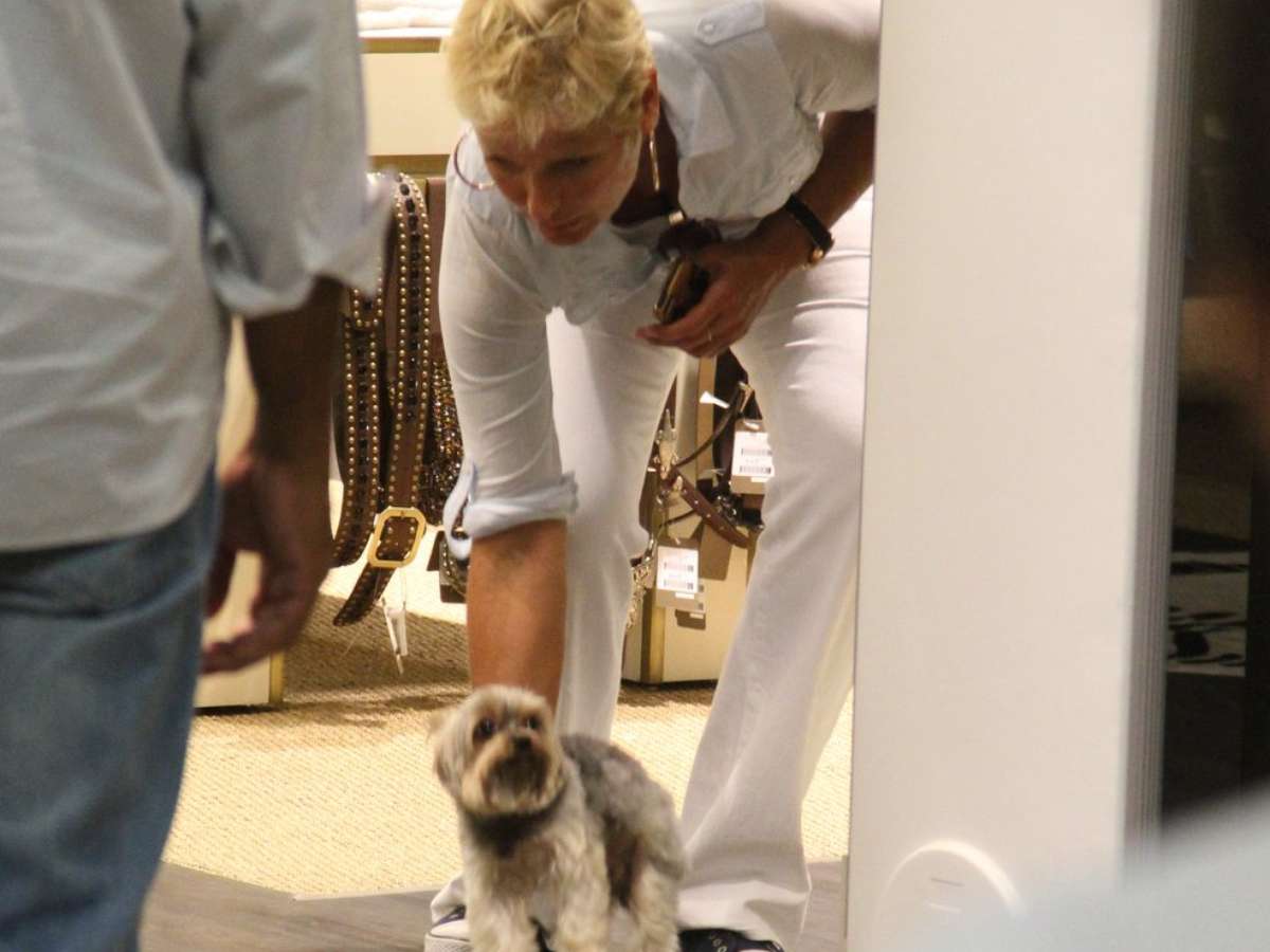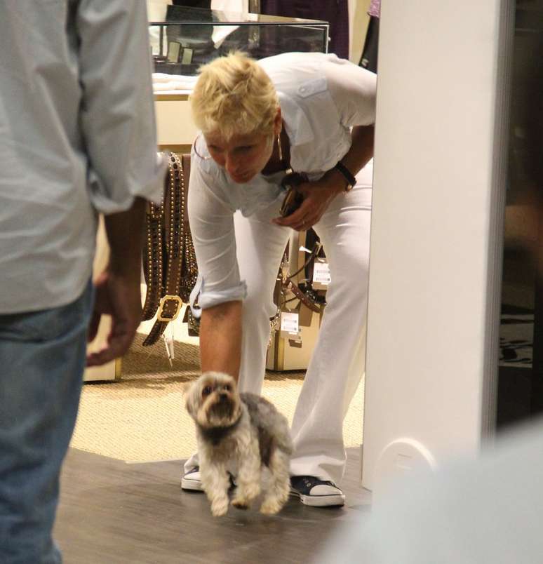 Xuxa fez um passeio por um shopping center no Rio de Janeiro na tarde desta terça-feira (12) com uma companhia inusitada: seu cãozinho Dudu, da raça yorkshire. Vestindo calça e camisa brancas, a apresentadora carregou o pet no colo