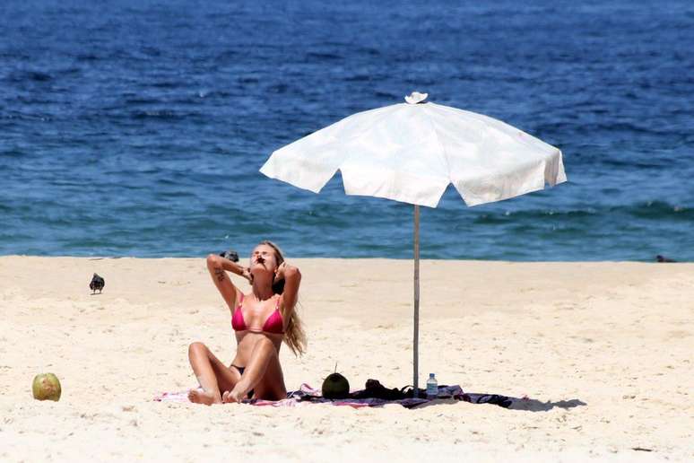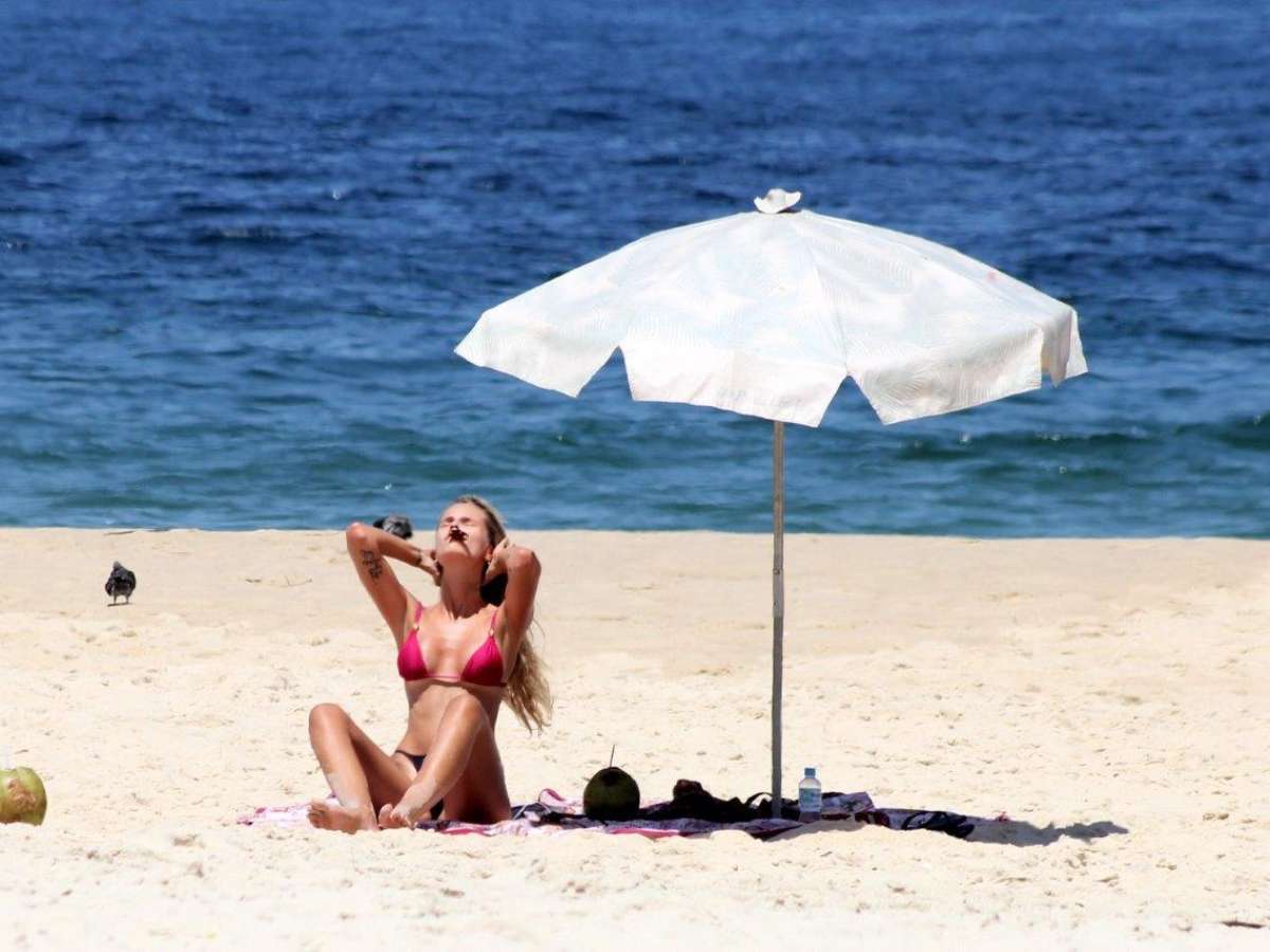 Yasmin Brunet aproveitou o sol nesta segunda-feira (10) para ir à praia de Ipanema, zona sul do Rio de janeiro. Na ocasião, a modelo foi clicada de biquíni enquanto reforçava o bronzeado, tomava água de coco e mexia no celular