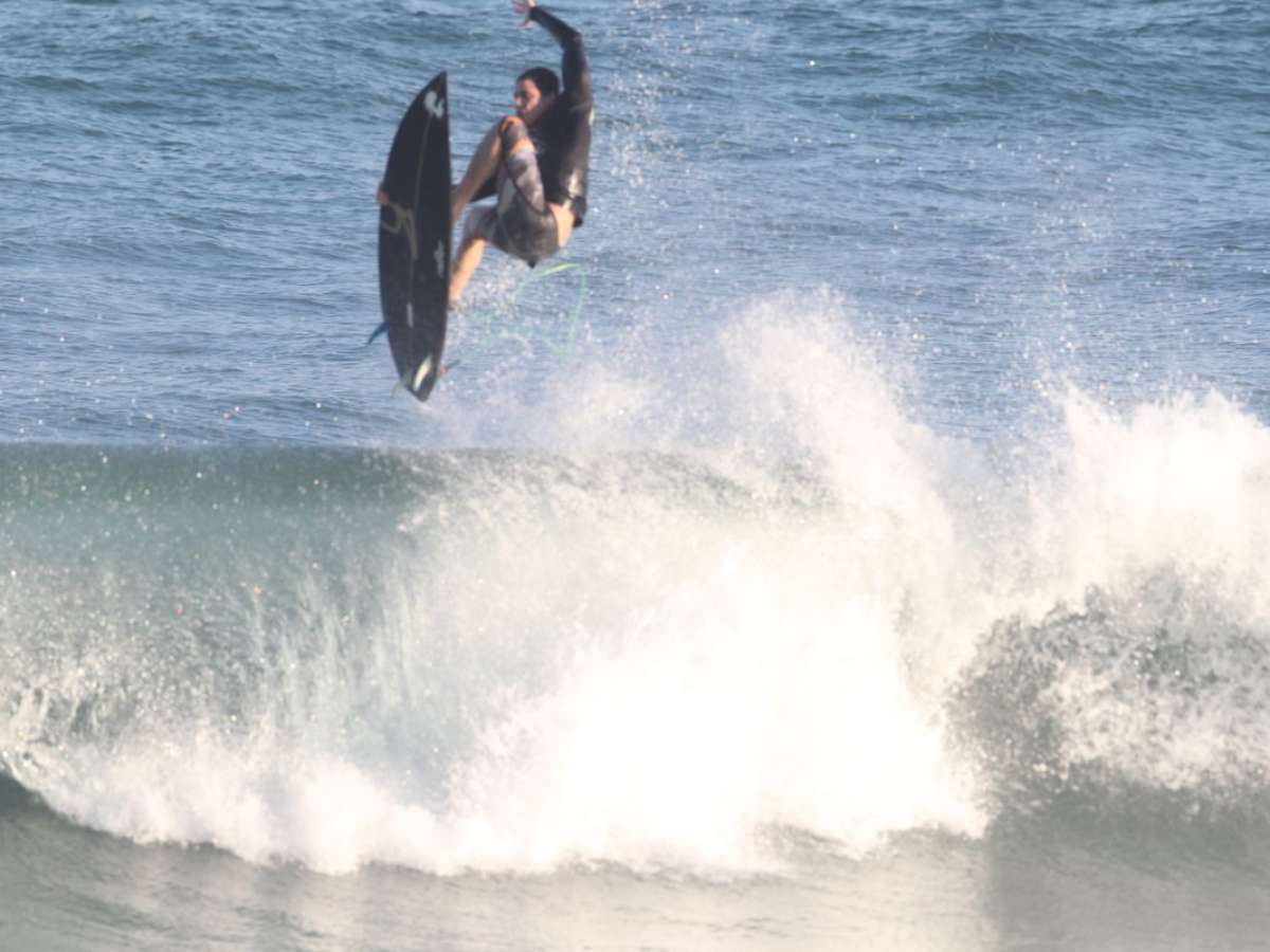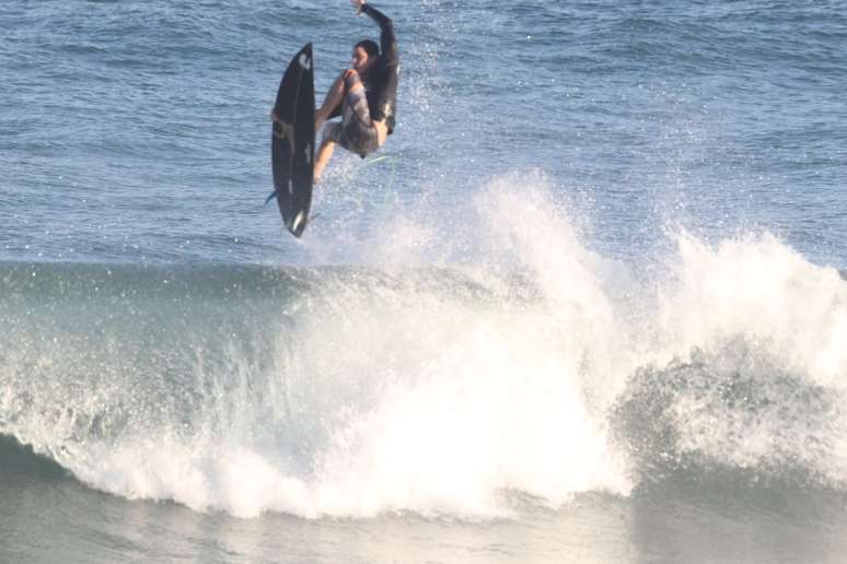 Rômulo Neto aproveitou esta segunda-feira (10), para surfar na Prainha, zona oeste do Rio de Janeiro. O ator demonstrou habilidade no esporte, dando vários aéreos durante o tempo em que ficou no mar