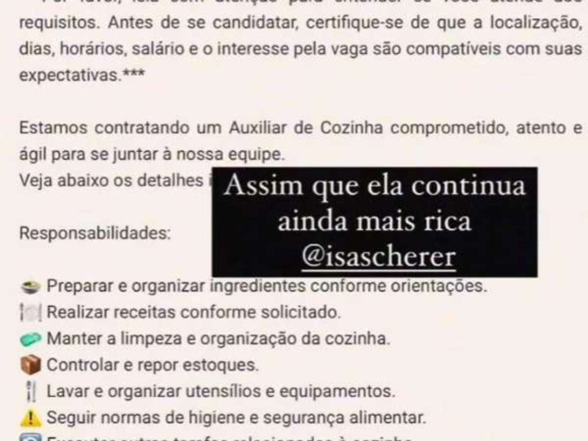 Com a repercussão, a página da chef foi inundada por comentários negativos. "Isa, levar o seu próprio chicote é um diferencial pra vaga?", ironizou Mayara Souza. Já Victória Maioral comentou com tom de desapontamento: "Bora vender bastante cookie pra eu gastar fortunas nas minhas bolsinhas e pagar um salário medíocre pros meus funcionários. Que decepção, Isabella".