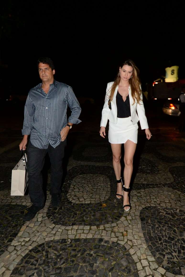 Nicole Bahls também estava entre os convidados e apostou em vestido justo e sandália gladidora amarrada na perna.