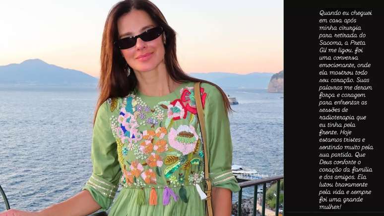 "Quando eu cheguei em casa após minha cirurgia para retirada do Sarcoma, a Preta Gil me ligou. Foi uma conversa emocionante, onde ela mostrou todo seu coração. Suas palavras me deram força e coragem para enfrentar as sessões de radioterapia que eu tinha pela frente", escreveu Vera Viel no Instagram.
