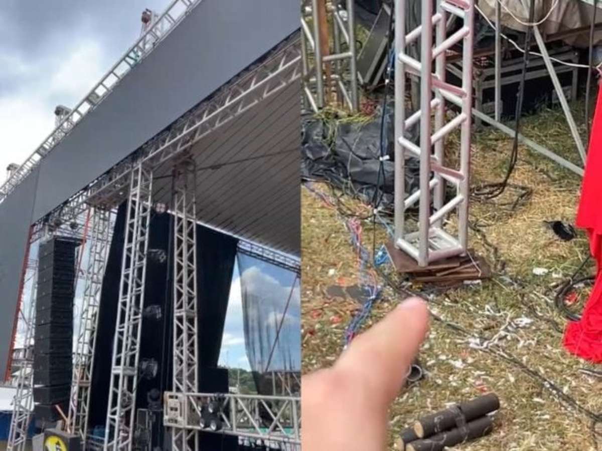 Em imagens divulgadas, é possível ver amarrações com cintos e torre apoiada sobre pedaços de madeira. A organização alegou que o local não suportariam um show.