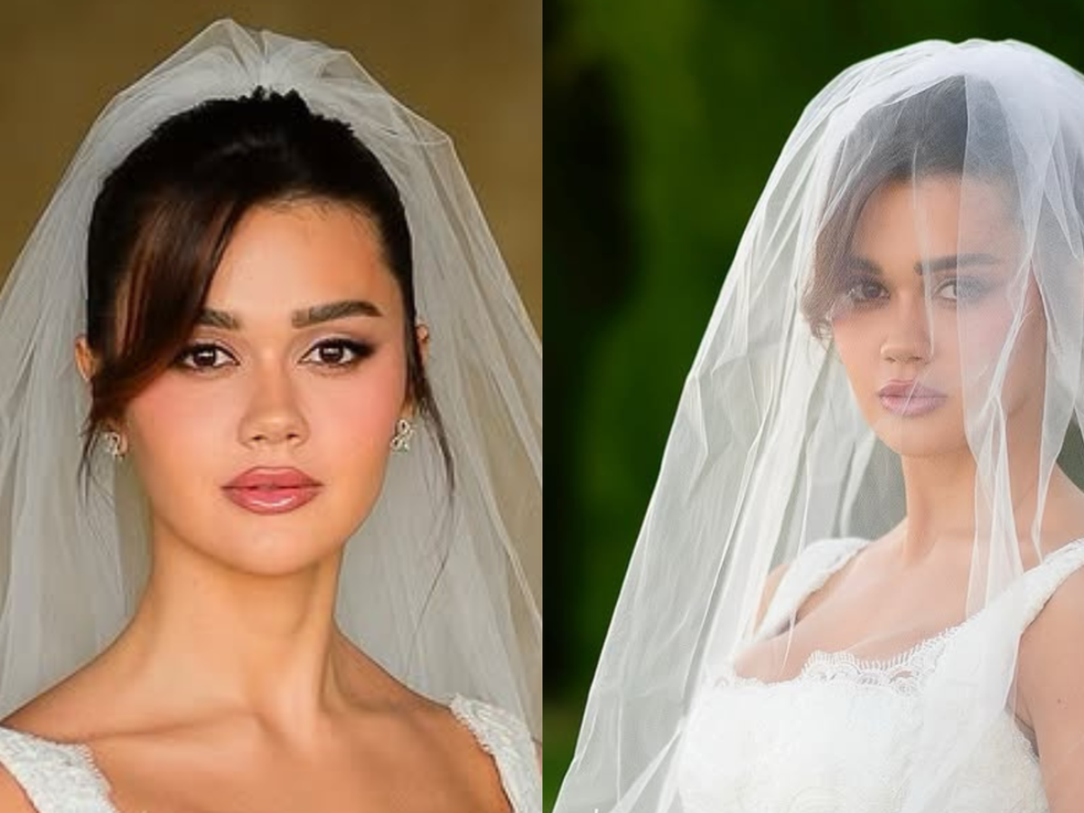 Franciny escolheu um vestido de noiva clássico. Com tecido branco encorpado com bordados delicadíssimos, a peça traz um corpete estruturado com decote quadrado, alças largas e uma saia volumosa e fluida. Ela completou a produção com um um véu translúcido que cobre suavemente o cabelo preso em um coque baixo.