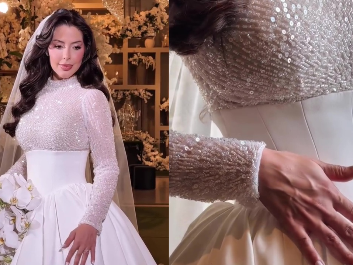 Laís exibiu um modelito com uma saia ampla e volumosa, com um corset de corte acinturado que reforçou a silhueta da ex-"BBB". Já a parte de cima foi toda bordada com pedrarias, com mangas longas e justas para reforçar a elegância da produção. O véu longo e o buquê de orquídeas brancas dão o toque final de romantismo.