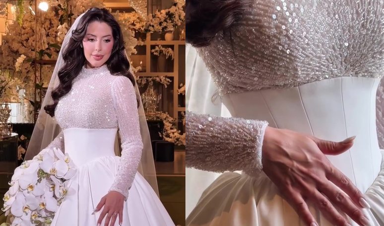 Vestido de noiva com 26 m de seda italiana, buquê de orquídeas e mais: o look de casamento da ex-'BBB' Laís Caldas em união com Gustavo Marsengo