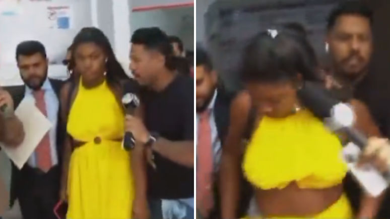 Raquel Brito, ex-A Fazenda e irmã de Davi Brito, foi à delegacia prestar depoimento sobre suspeitas de divulgar plataformas de jogos de azar, mas viralizou nas redes após seu vestido arrebentar ao sair do local.