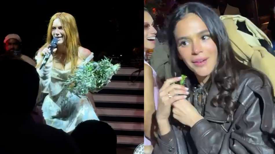 A atriz renovou os votos de casamento com Bruno Gagliasso na noite de sábado, 9, ao lado da família e de personalidades da mídia. Bruna Marquezine tentou segurar o buquê da noiva, mas conseguiu pegar apenas um raminho. Na crença popular, acredita-se que quem pega o buquê em um casamento é a próxima pessoa a se casar. Em um vídeo publicado por Hugo Gloss, é possível perceber que Marquezine quase conquistou o ramo de arruda, mas outro convidado acabou segurando a maior parte. Reprodução/Instagram/@hugogloss/MyHood