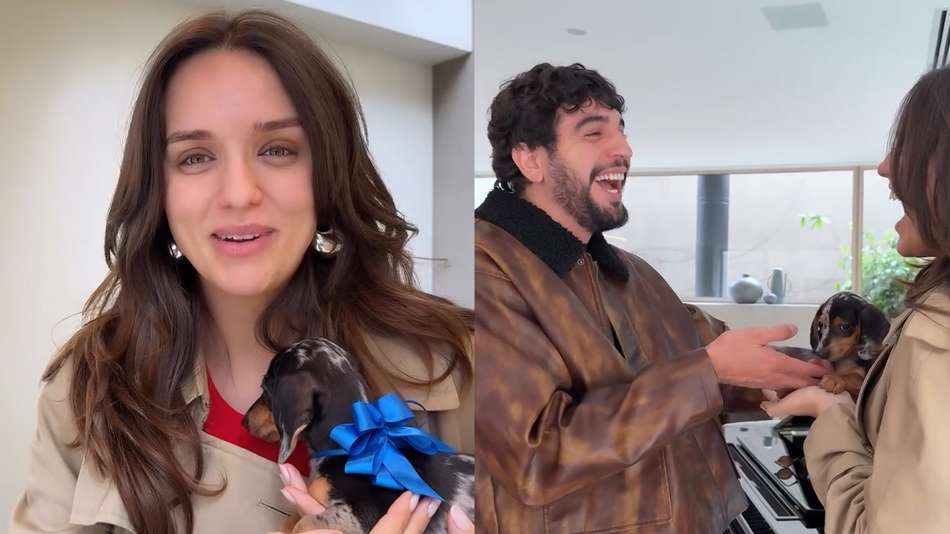 Na última segunda-feira, 4, a influenciadora presenteou o namorado com um cachorro da raça dachshund. “O sonho dele é ter esse cachorro! Ele fala mil vezes”, contou ela, em uma rede social. "Meu Deus, é muito lindo”, afirmou o cantor, que escolheu batizar o animal com o nome de Ervilha. O casal está junto desde dezembro de 2024 e estão esperando a primeira filha. Reprodução/Instagram/rafakalimann