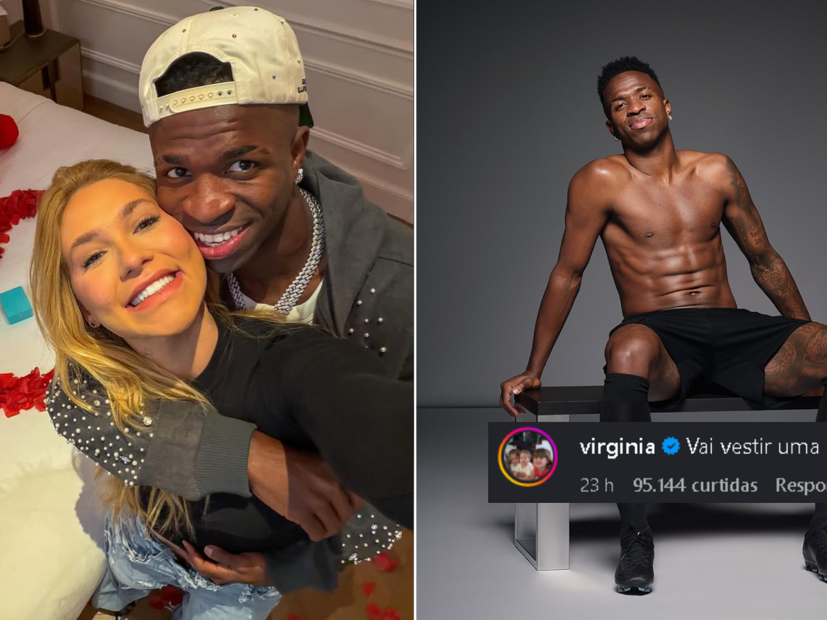 Vini Jr compartilhou fotos no Instagram promovendo um perfume e recebeu um comentário brincalhão de sua namorada, Virginia, pedindo para ele vestir uma camisa, o que gerou reações de internautas.