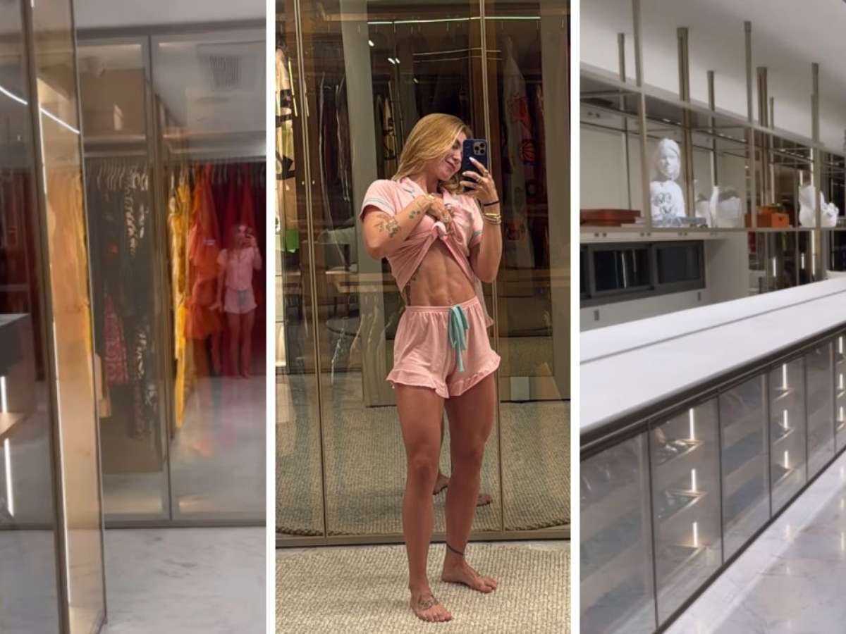 "Closet está finalmente pronto. Que coisa mais linda", celebrou ela, que ainda fez uma selfie no local em que exibe sua barriga sarada - segundo ela, fruto de seu empenho na academia e das cirurgias estéticas.