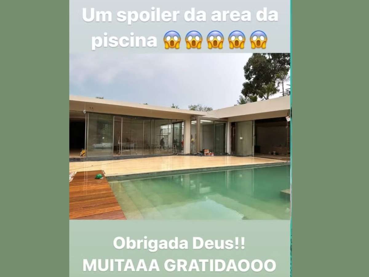 Ela recebeu fotos da casa que está sendo construída em um terreno de 7 mil metros quadrados em Goiânia, Goiás, e resolveu mostrar um pouco da área da piscina, com um deck de madeira.