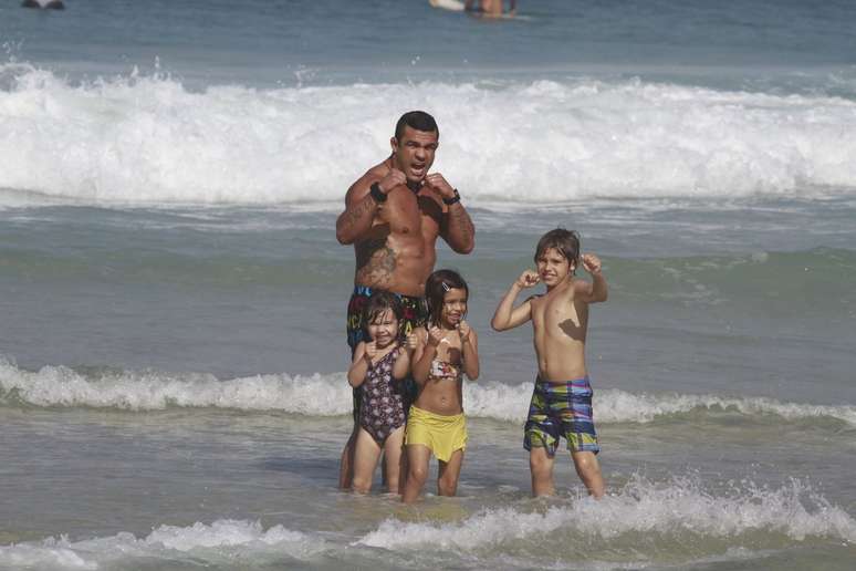O lutador Vítor Belfort teve uma manhã tranquila com os filhos, nesta terça-feira (11). Na praia da Barra da Tijuca, no Rio de Janeiro, ele foi clicado com as crianças, enquanto se divertia no mar e fazia poses para o fotógrafo. Casado com Joana Prado, Vítor é pai de duas meninas e um menino, Davi, Victoria e Kyara