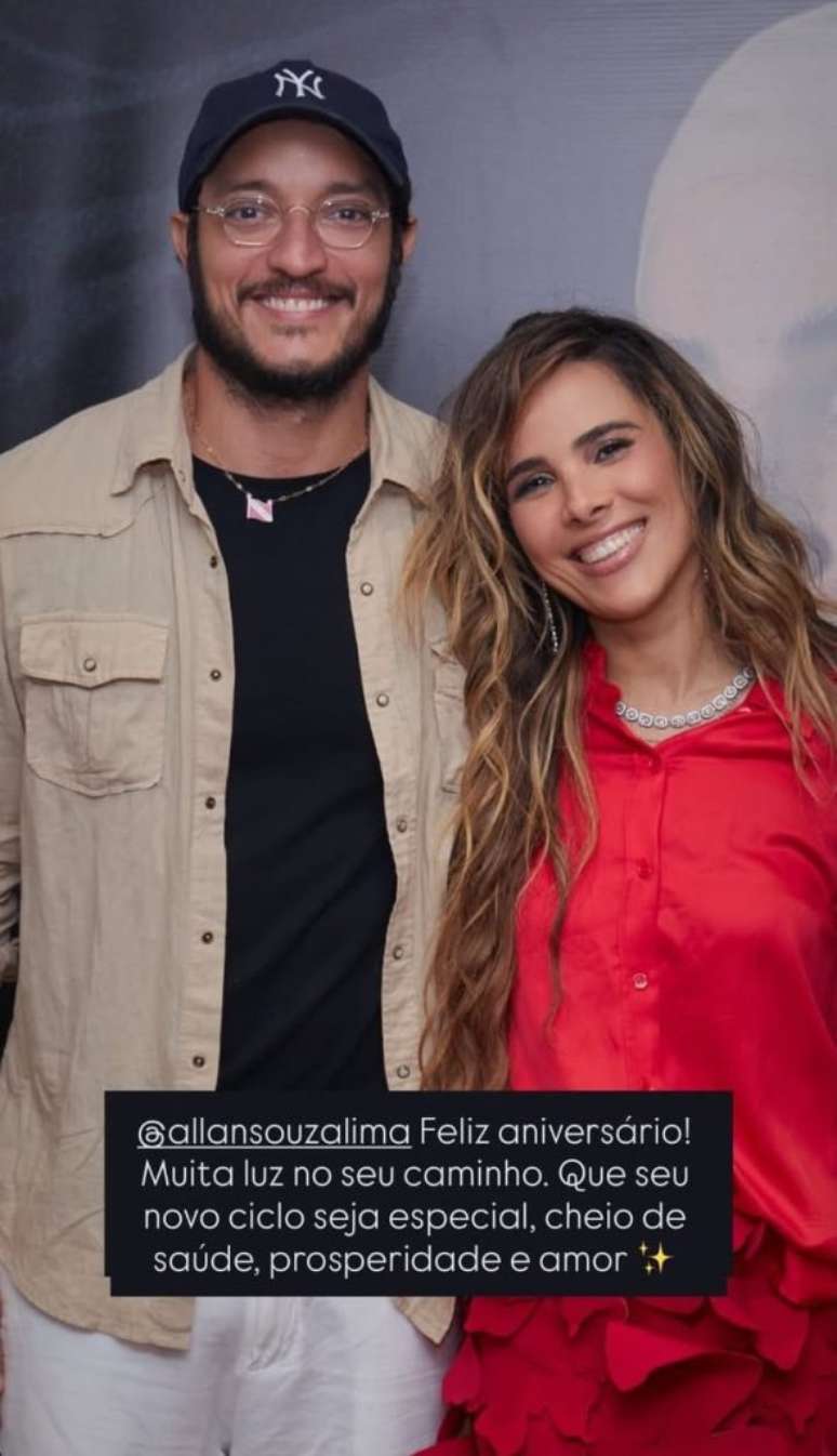 Nesta terça-feira (18), Wanessa Camargo usou suas redes sociais para celebrar o aniversário de Allan Souza Lima, que completa 40 anos. Nos Stories, a cantora publicou uma foto ao lado do ator e escreveu uma mensagem carinhosa desejando boas energias. Em suas palavras, ela afirmou: "Allan, feliz aniversário! Muita luz no seu caminho. Que seu novo ciclo seja especial, cheio de saúde, prosperidade e amor", deixando evidente o carinho entre eles.