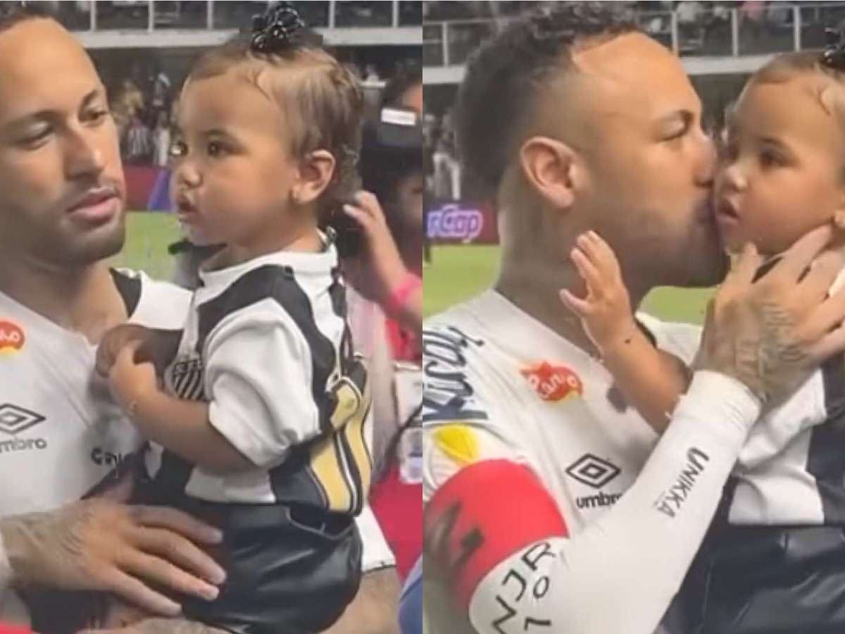 Em vídeo que viralizou nas redes sociais, o papai coruja apareceu com a pequena no colo. Neymar apareceu lhe dando um beijo antes de retornar ao gramado.