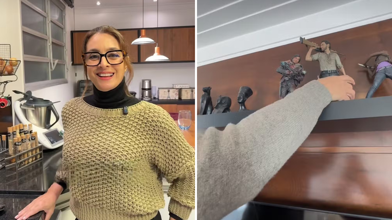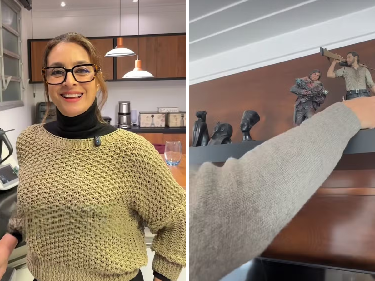 Além disso, Cátia e Rodrigo colecionam peças de interesse histórico e cultural. Ela, apaixonada pela história do Egito, decorou o apartamento com bustos de Tutancâmon e da rainha Nefertiti. Esses artefatos convivem com personagens zumbis da série Walking Dead, uma das favoritas do casal. O espaço também guarda lembranças especiais, como uma cédula de R$ 100 dobrada em formato de aviãozinho, presente de Silvio Santos, e uma bola de basquete autografada por Oscar Schmidt, reforçando a mistura de cultura, esportes e memórias afetivas na decoração.