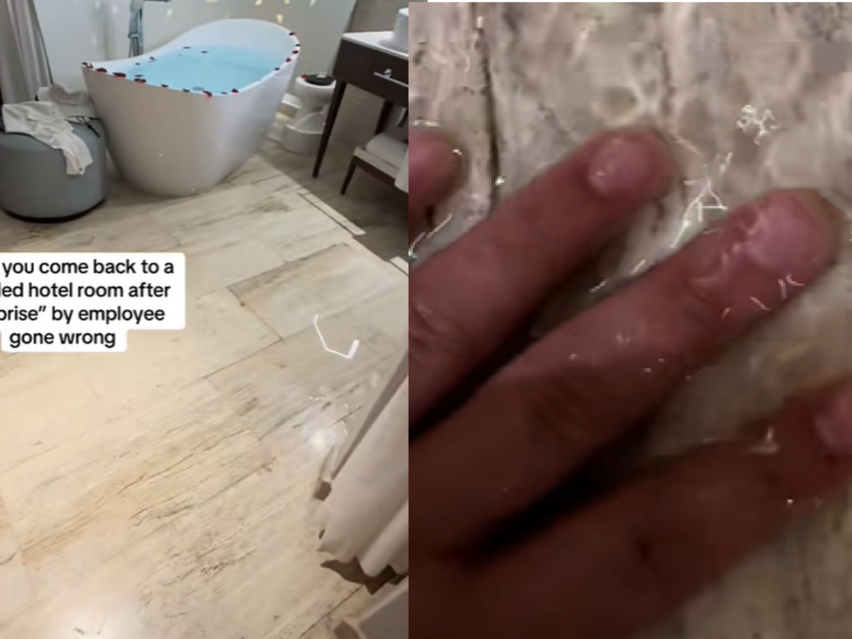 Casal em Cancún é surpreendido com suíte alagada ao invés de decoração romântica prometida, vídeo viraliza nas redes sociais.