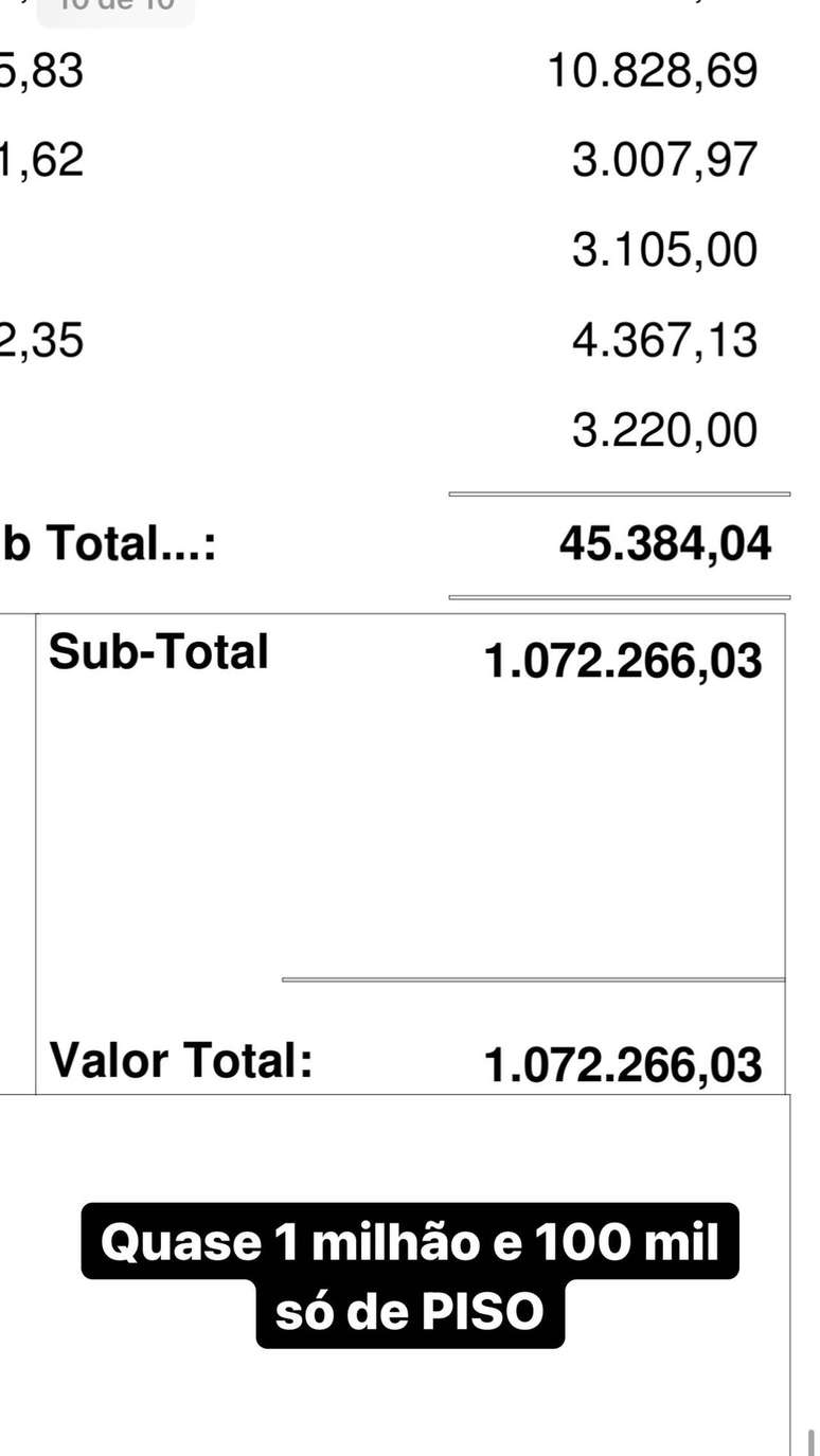Segundo a influenciadora, o gasto foi grande por causa do tamanho da mansão, que tem 900 metros quadrados. Além disso, ela comprou materiais caros, como mármore. “A casa é grande, então é muito piso”, afirmou. “Não quero nem ver quando for colocar os móveis", brincou ainda.