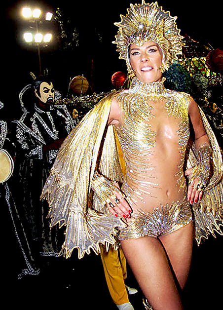 Adriane Galisteu usa fantasia dourada transparente em desfile da Unidos da Tijuca em 2009. Foto: Rudy Trindade/ Futura Press.