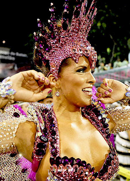 Renata Santos mostra detalhes da fantasia que usou no desfile da Mangueira em 2010. Foto: Futura Press.