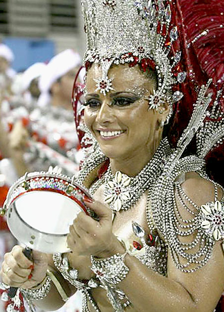 Viviane Araújo toca tamborim durante desfile da Salgueiro em 2009. Foto: Rudy Trindade/Futura Press .