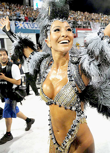Sabrina interage com o público nas arquibancadas durante passagem da Gaviões da Fiel pelo Sambódromo, em 2009. Foto: Adriano Vizoni /Futura Press.