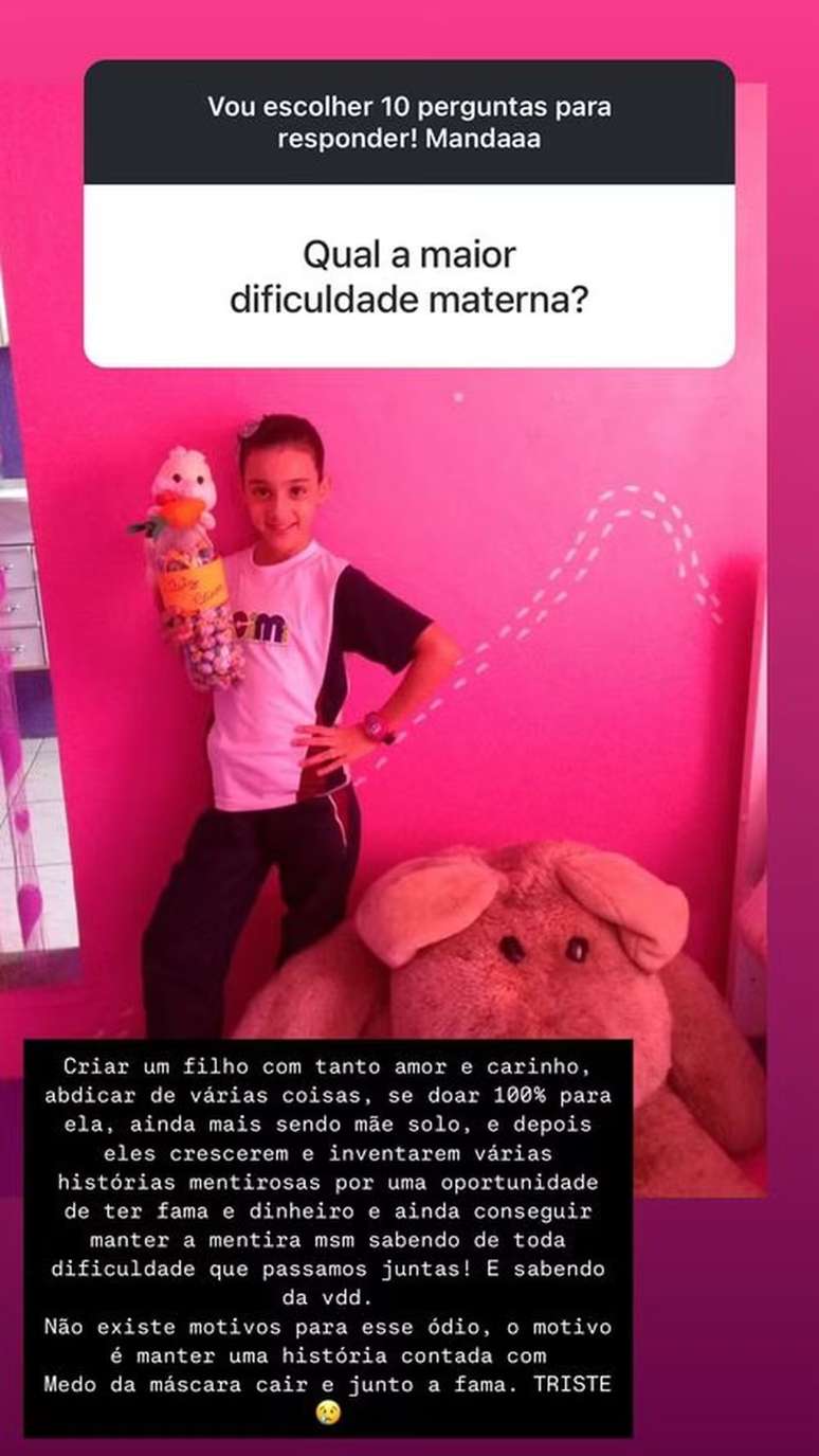 "Criar um filho com tanto amor e carinho, abdicar de várias coisas, se doar 100% para ela, e depois vê-los crescer e inventar várias histórias mentirosas para ganhar fama e dinheiro, mantendo a mentira mesmo sabendo das dificuldades que passamos juntas! Não há motivo para esse ódio, apenas o medo de que a verdade venha à tona e a fama se perca. TRISTE."