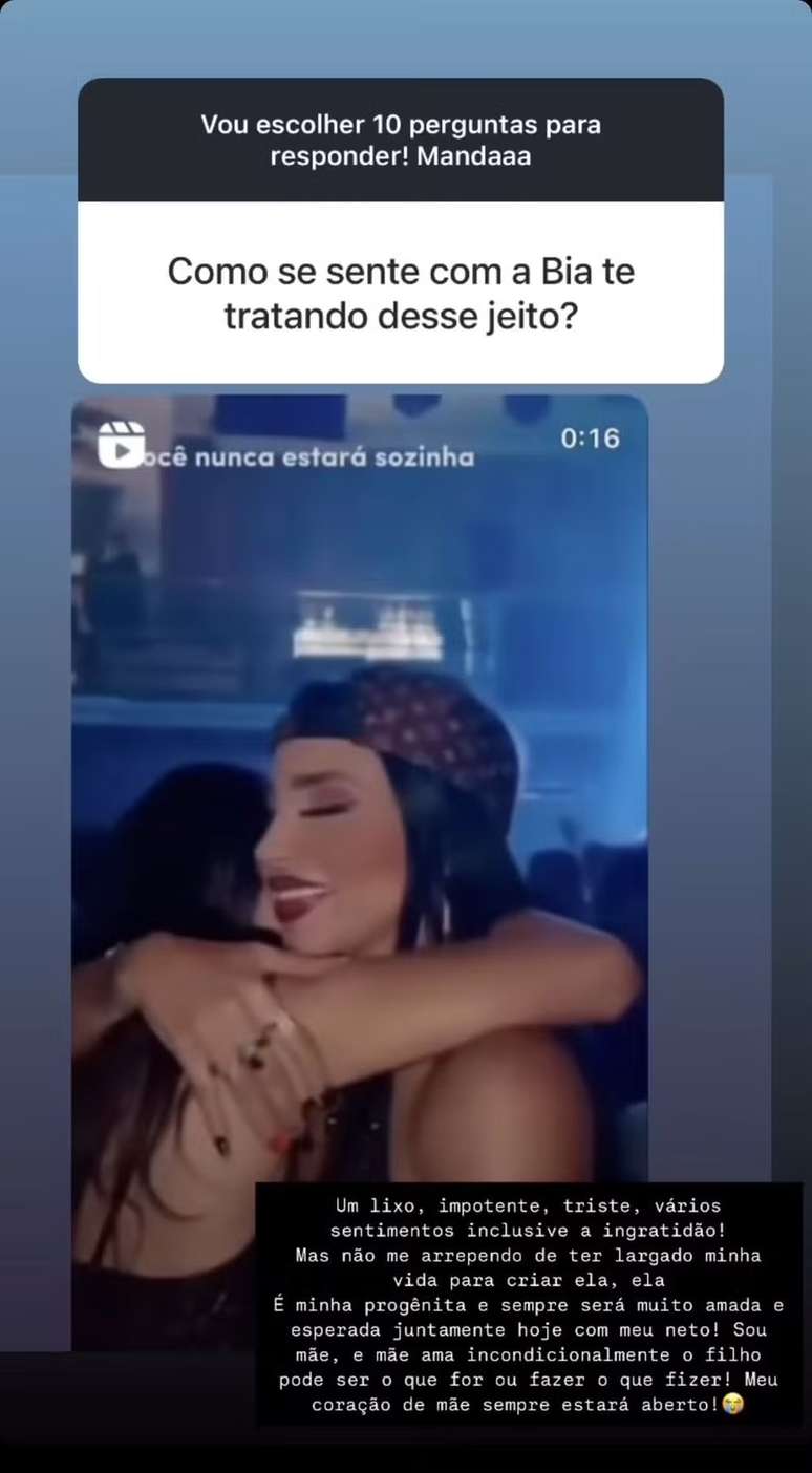 Em conversa com os fãs no Instagram, Jenny comentou que se sente impotente por não estar presente na vida da influenciadora, que deu à luz há dois meses. A ex-Fazenda ainda afirmou que não entende o motivo de Bia sentir tanto desprezo pela família.