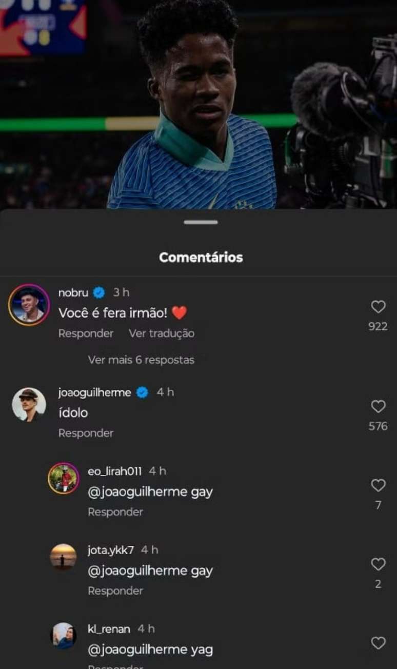 No último sábado, 23, João Guilherme, de 22 anos, foi alvo de comentários homofóbicos após elogiar a atuação de Endrick no jogo da Seleção Brasileira.
