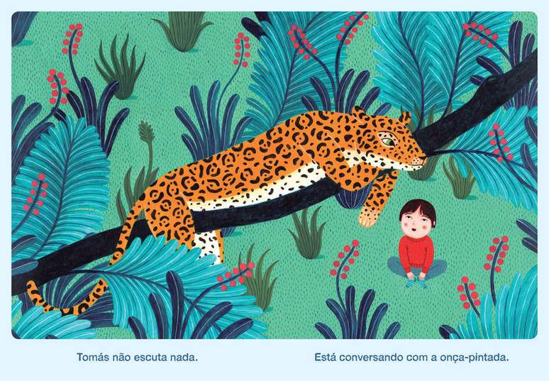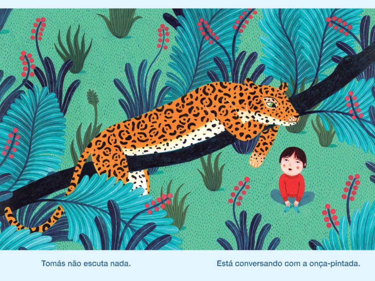 A mãe de Tomás faz um bolo e passa a procurá-lo pela casa para servir o doce para o menino. Mas, com sua imaginação, ele vai para outro mundo. A mãe o chama, mas ele parece não ouvir. Tomás vê um vulcão em erupção, galopa em um unicórnio, flutua perto da Lua, voa em um tucano até uma ilha tropical, conversa com uma onça pintada. As imagens misturam o real com a imaginação. E, depois, a mãe entra na brincadeira. Publicado originalmente no Chile.