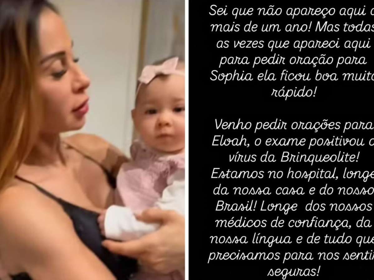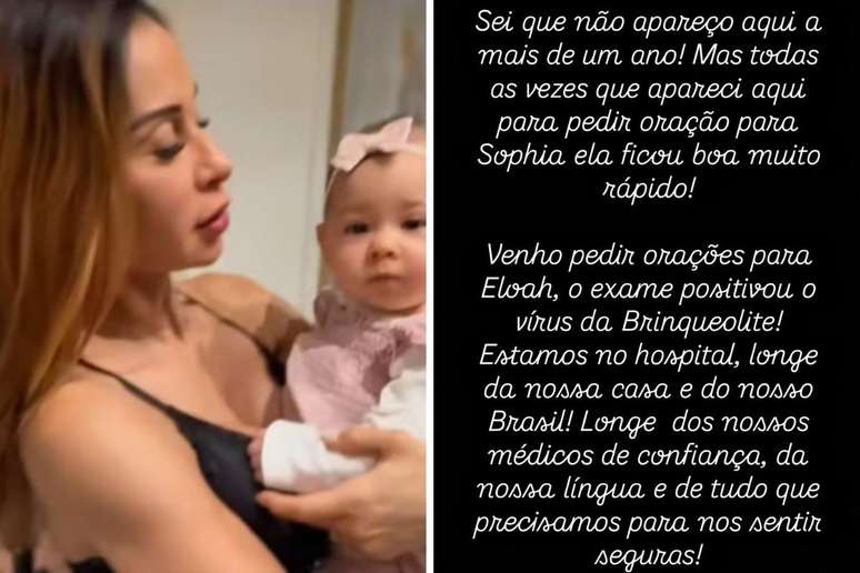 “Sei que não apareço aqui há mais de um ano! Mas, todas as vezes que apareci para pedir oração para a Sophia, ela ficou boa muito rápido. Venho pedir orações para a Eloah: o exame deu positivo para o vírus da bronquiolite! Estamos no hospital, longe da nossa casa e do nosso Brasil, longe dos nossos médicos de confiança, da nossa língua e de tudo o que precisamos para nos sentir seguras. Orem por ela”, pediu a ex-BBB.